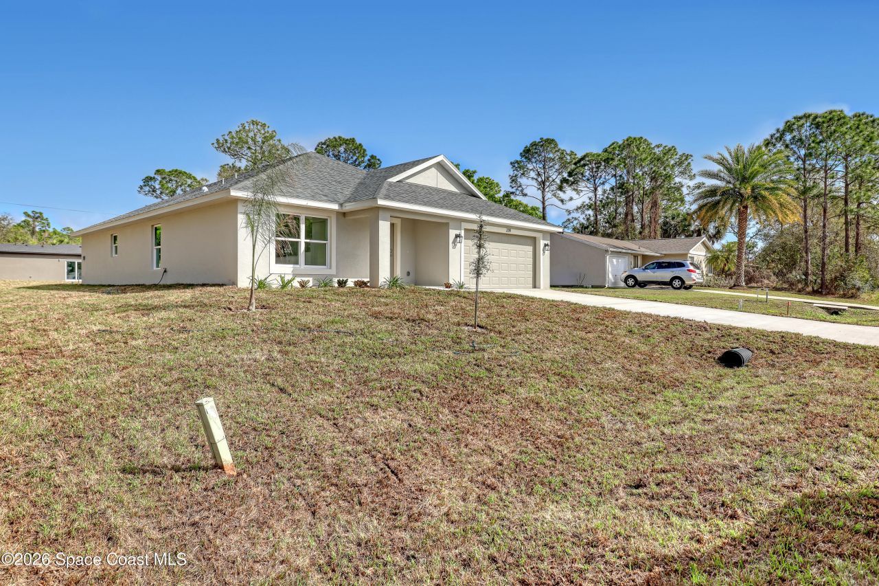 Construction Completed - New construction home with hurricane impact windows and doors and a full home water treatment system already installed. This 3 bedroom, 2 bathroom home offers 1,632 square feet under air with high cathedral ceilings that create a bright and open living space. The kitchen features granite countertops, stainless steel appliances, and luxury vinyl plank flooring throughout the home. Oversized bedrooms provide comfortable living, and the dedicated laundry room includes a washer and dryer. Enjoy the large covered rear porch and the convenience of a two car garage. Located in Palm Bay and built by a local builder, offering the peace of mind that comes from quality construction and attention to detail.